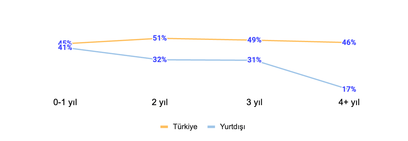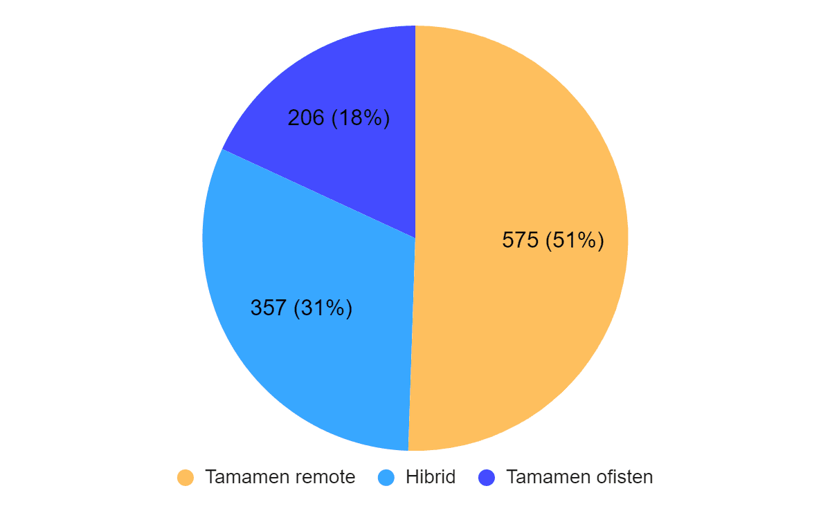 Ankete katılanların yarısı tamamen remote çalışıyor. Bu oran global ortalamanın (%60) gerisinde olsa da, tamamen ofisten çalışma oranı global ortalama (%15) ile paralel.