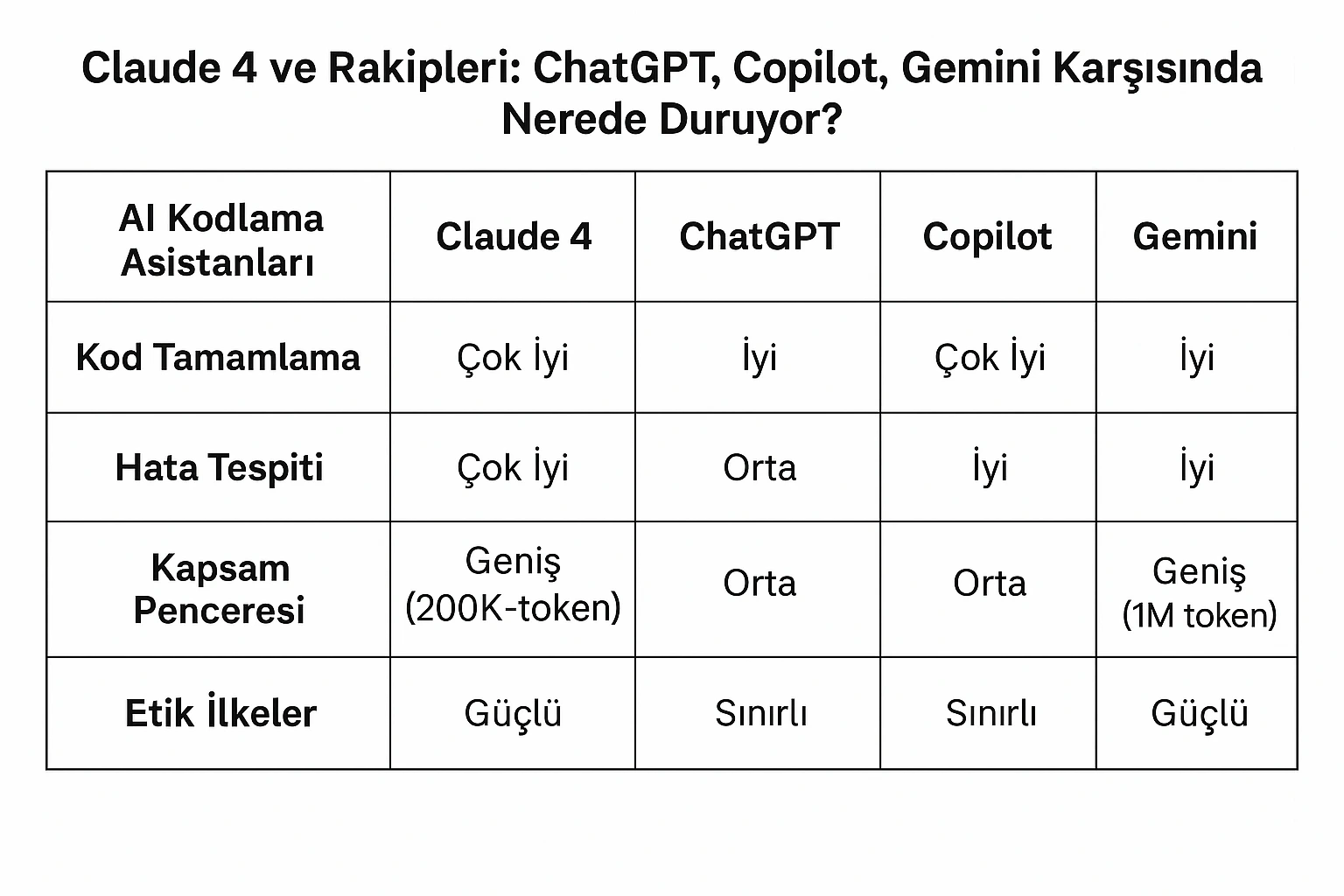 Bugüne kadar ChatGPT, GitHub Copilot ve Google Gemini gibi modellerin AI destekli kodlama alanındaki başarılarına tanıklık ettik. Ancak Claude 4, yalnızca daha doğru sonuçlar vermekle kalmıyor; etik ilkelerle yönlendirilmiş, çok katmanlı bir akıl yürütme yeteneği sunarak fark yaratıyor. Geliştiriciler için daha az hatayla, daha hızlı ve yaratıcı çözümler üretmeyi mümkün kılıyor.