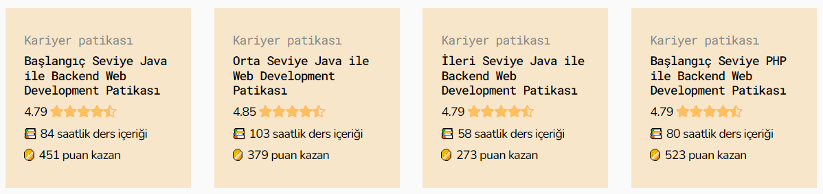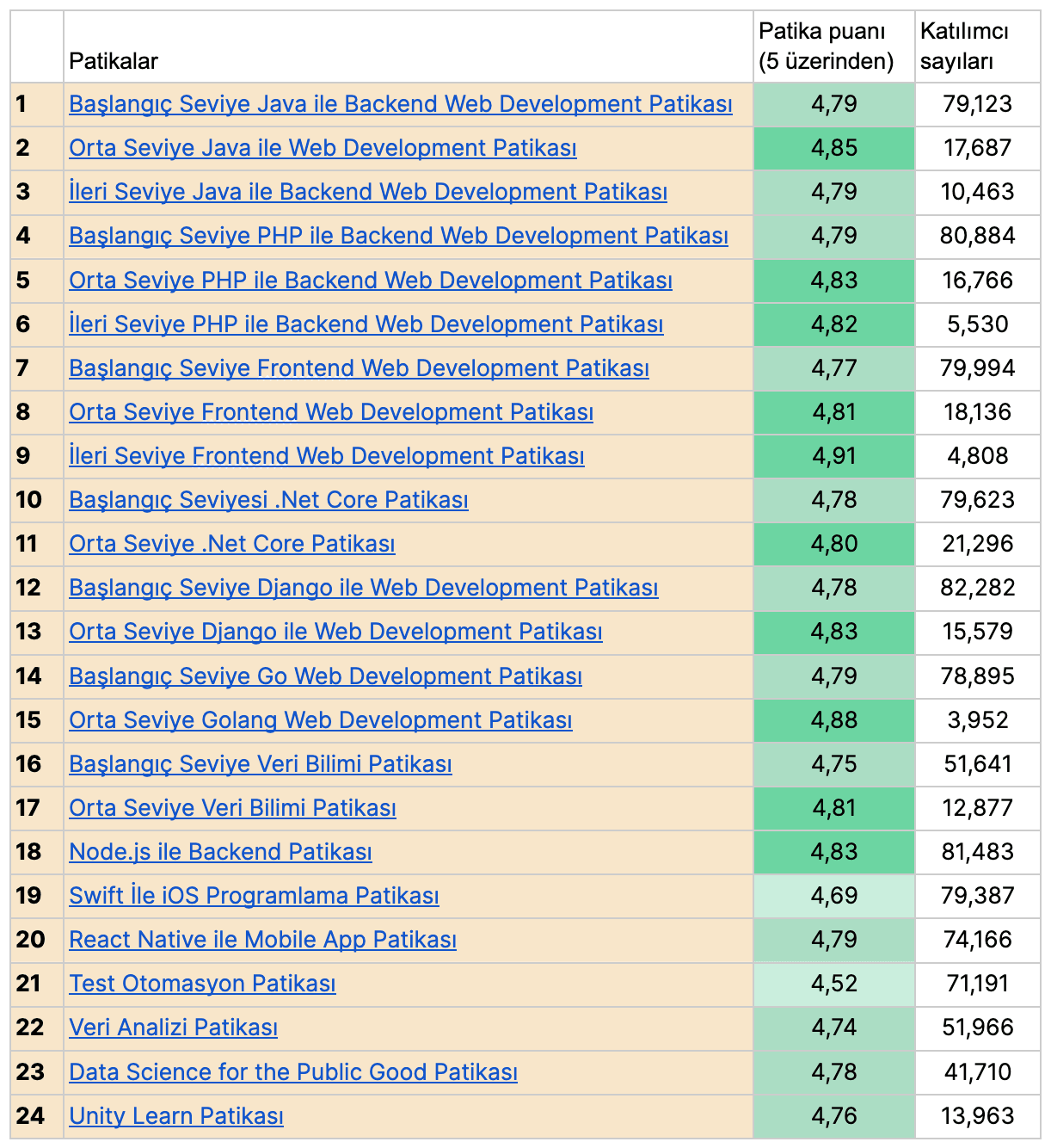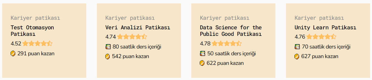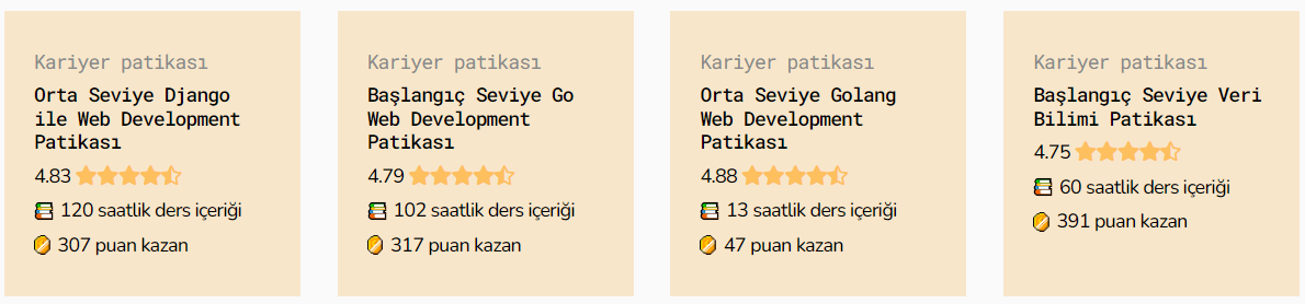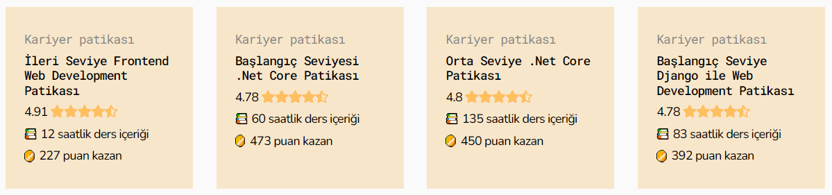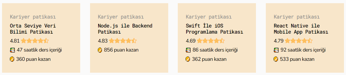 İçerikler, türkçe kaynak sorununu çözecek, yazılıma başlamak isteyen herkesi kapsayacak şekilde sadece teorik değil, alıştırma ve projelerle de desteklenerek Türkiye’nin deneyimli yazılımcıları ve uluslararası partnerlerimizle oluşturuldu. İçerikler, kullanıcılar tarafından oylanabiliyor ve yorumlar bırakılabiliyor. İşte patikaların puanları:
