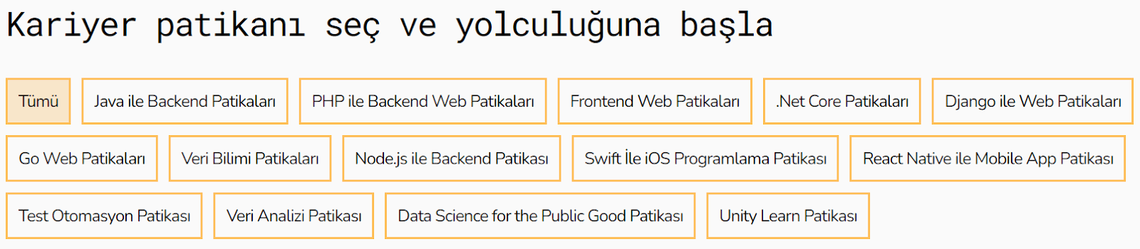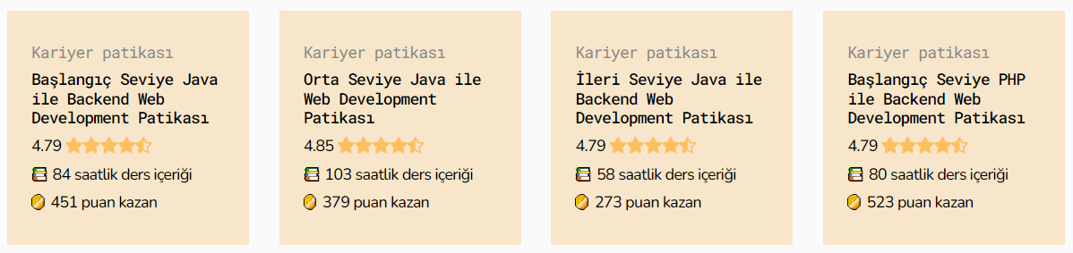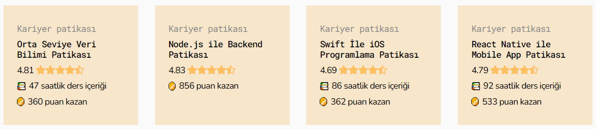 App.patika.dev’de 24 kariyer patikası, bu 24 patikanın altında 62 ders ve toplam 996 saatlik içerik ve projeler yer alıyor. Java, PHP, .Net Core, Python, Node.js backend dillerinden frontend’e; iOS Swift ve React Native mobil uygulama dillerinden test otomasyona; Veri Bilimi içeriklerinden Veri Analizi’ne kadar birçok alanda içerik bulunuyor.