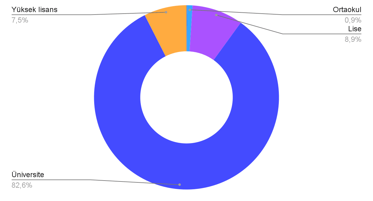 Kullanıcıların ~%83’ü üniversite okuyor ya da mezun olmuş, %7,5 ise yüksek lisans okuyor ya da mezun olmuş.