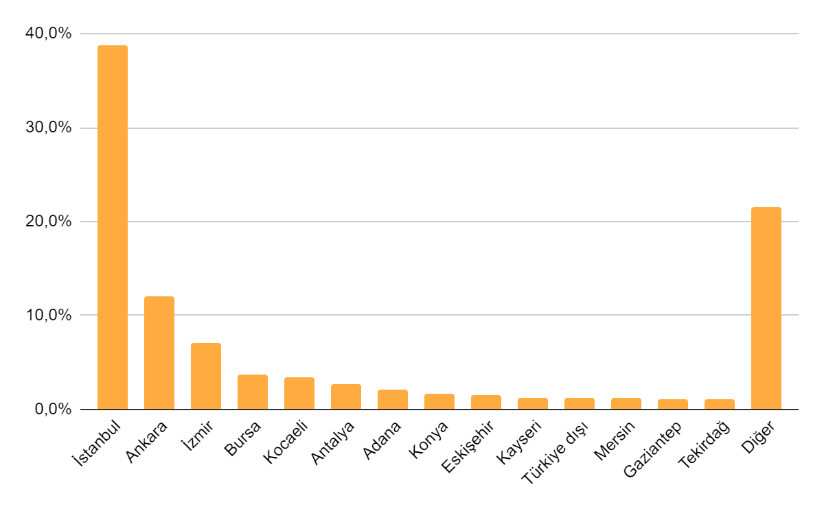 Kullanıcılar Türkiye’nin 81 iline dağılmış durumdalar. En çok kullanıcı İstanbul, Ankara, İzmir, Bursa ve Kocaeli’de yaşıyor. En çok kullanıcının olduğu ilk 10 şehirse yukarıdaki gibi.