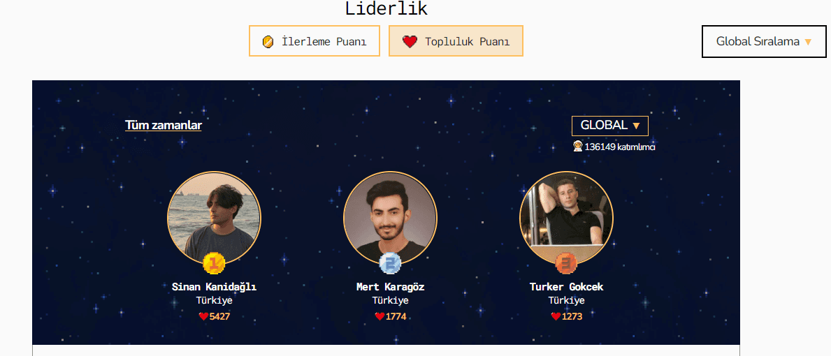 Liderlik tablosundaki diğer oyunlaştırmaysa topluluk puanı. Topluluk puanı kişilerin platformda öğrenen diğer kişilerle ne kadar bağlantı kurarsa, kendi profilini ne kadar canlı tutarsa o kadar puan topladıkları yer. Arkadaşlarını davet ettiklerinde, bir kullanıcıya teşekkür ettiklerinde, bir kullanıcının projesini değerlendirdiklerinde, yorumları beğendiklerinde ya da profillerini doldurduklarında topluluk puanı kazanıyor ve haftalık değişen en’ler tablosunda yerini alıyor. Burada da amaç, öğrenen kişilerin birbirleriyle etkileşim haline girmesini ve birbirlerine destek olmasını sağlamak ve öğrenmeyi eğlenceli hale getirmek.