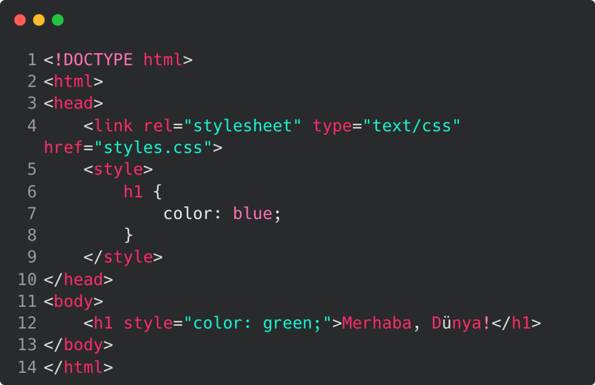 - Harici Stil (External CSS): Stil bilgileri, ayrı bir CSS dosyasına yazılır ve HTML belgesine <link> etiketi ile bağlanır.