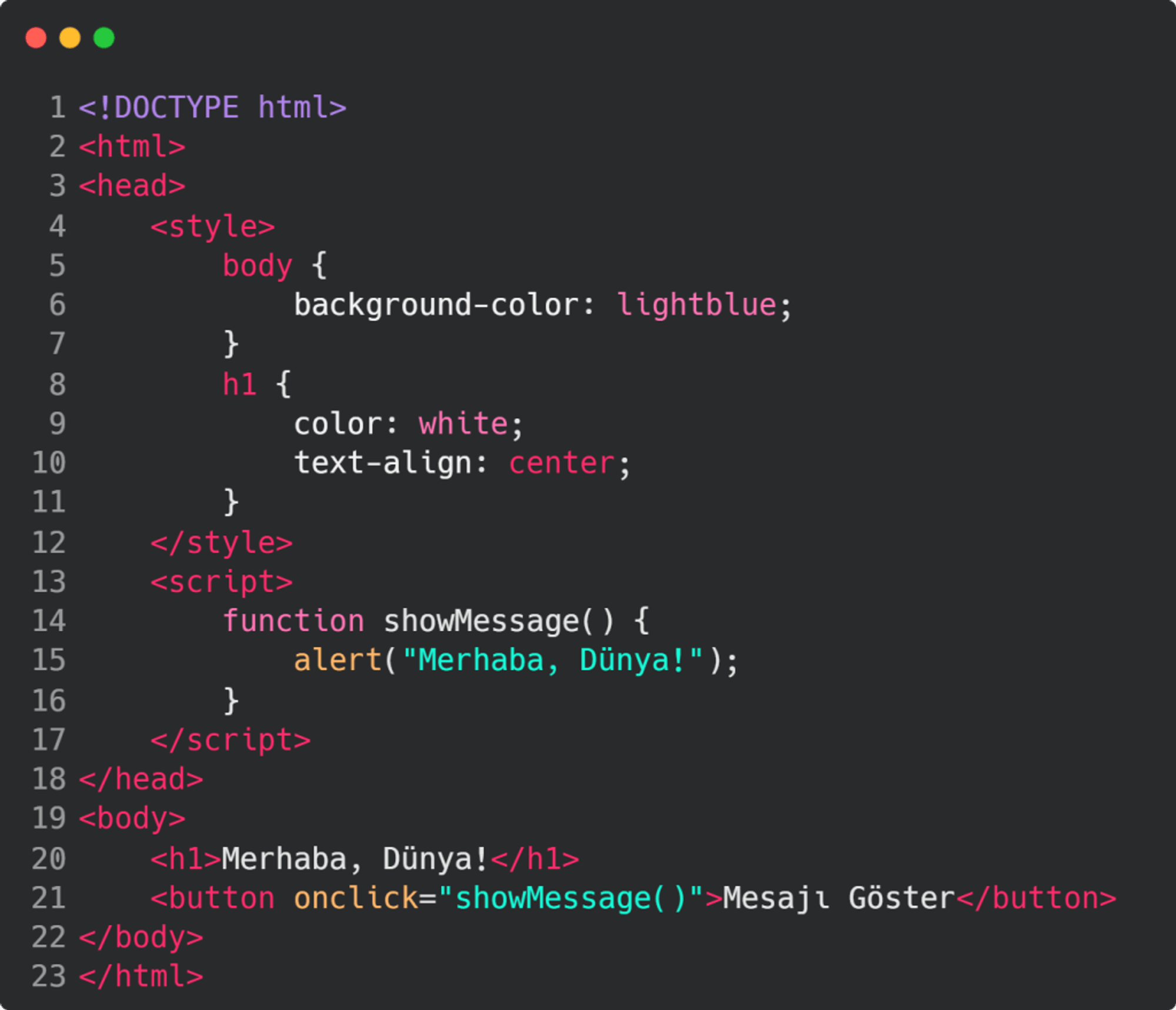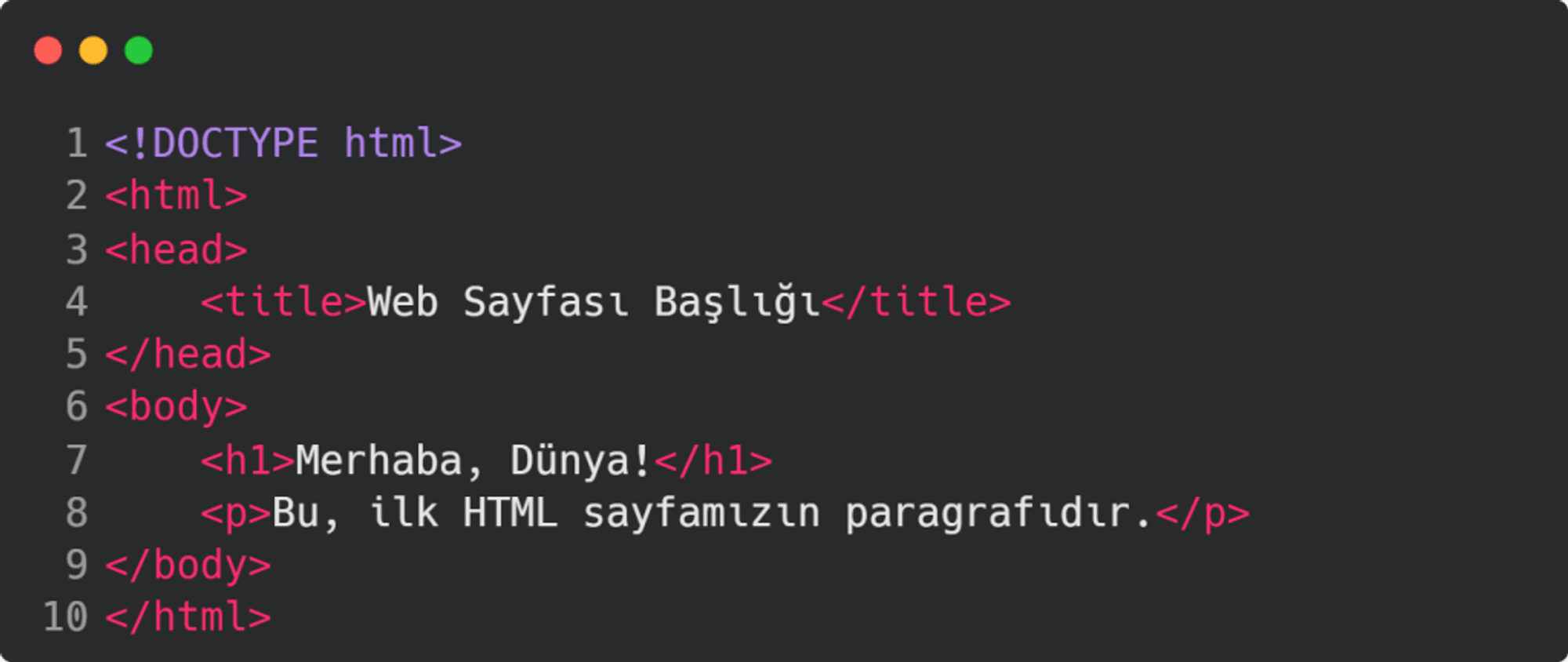 - <!DOCTYPE html>: Bu satır, belgenin HTML5 standardına uygun olduğunu belirtir.