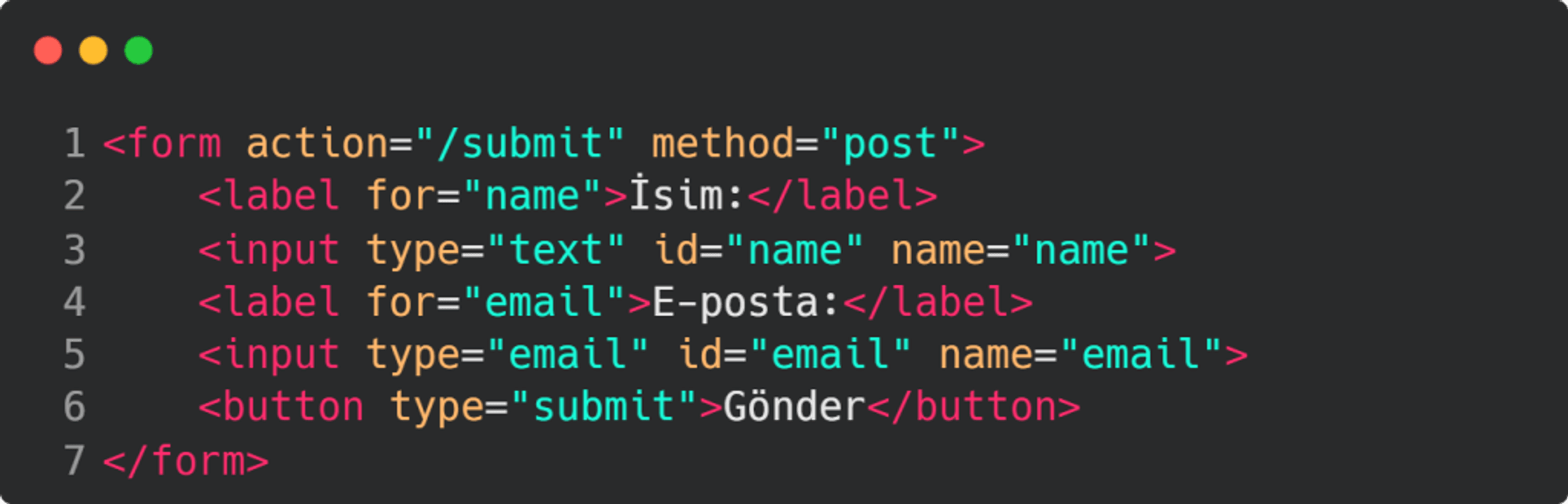 HTML, kullanıcı girdilerini almak için formlar oluşturmak için de kullanılır. Formlar, kullanıcıların veri girişi yapmalarını ve bu verileri sunucuya göndermelerini sağlar. <form>, <input>, <textarea> ve <button> gibi etiketler form elemanlarını oluşturmak için kullanılır. Örneğin, bir web sitesinde üyelik formu, kullanıcıların kayıt olmasını sağlar.
