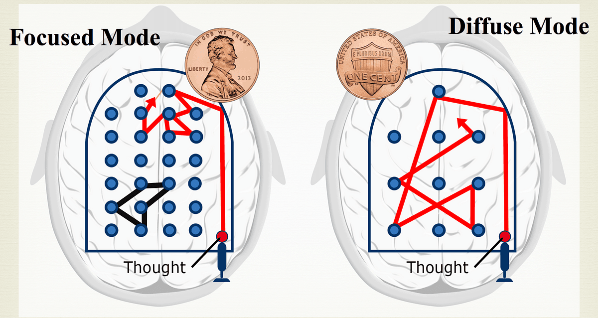 Dağınık mod ise, zihnin daha rahat ve serbest olduğu anlarda devreye girer. Bu mod, genellikle yürüyüş yaparken, duş alırken veya başka rahatlatıcı aktiviteler sırasında aktif hale gelir. Dağınık mod, problem çözme sürecinde genellikle göz ardı edilen yaratıcı çözümleri ve 'aha' anlarını beraberinde getirir. Bu mod, beynin farklı bölgeleri arasında daha serbest ve rastgele bağlantılar kurar, böylece daha önce düşünülmemiş fikirlerin ve çözümlerin ortaya çıkmasını sağlar. Örneğin, bir programlama problemi üzerinde saatlerce çalıştıktan sonra verilen bir mola sırasında, birdenbire problemin çözümü aklınıza gelebilir.