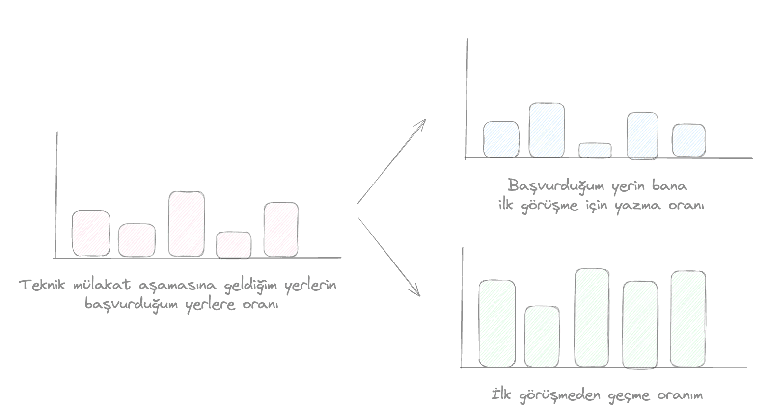 3. Analiz yapmak: Şimdi biraz ciddileşelim. 'Soğanı katman katman ayırmak' diye bir yöntem vardır, iş hayatında bir problemi çözerken en sevdiğim yöntemlerden biri. Burada, bir oranın neden düşük olduğunu anlamak için, o sayıyı oluşturan bileşenlere ayırıp bu bileşenlerin gidişatına bakmak çok fikir verebilir. Mesela aşağıdaki gibi bir analiz çıkarabilirsiniz: Diyelim ki teknik mülakat aşamasına bir türlü gelemiyorsunuz. Bunun sebebi, daha ilk başvuru aşamasından geçemiyor olmanız da olabilir, İK görüşmelerinde elenmeniz de. Hangisine odaklanmanız gerektiğini ancak iki kısma da bakıp anlamak gerek. Örneğin aşağıdaki durumda, bu adayın başvurduğu yerlerden daha çok dönüş almaya çalışacak şeyler yapması daha kritik, çünkü zaten mülakata girse bir şekilde geçiyor.