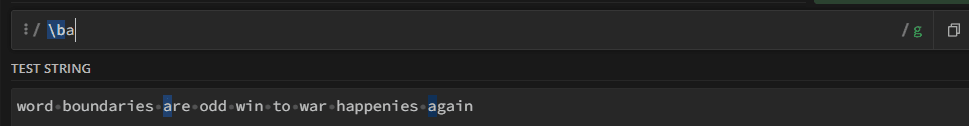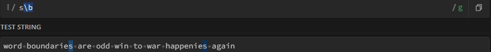 Diyelim ki, "word boundaries are odd win to war happiness again" string verisindeki sonunda word karakteri olmayan "s" karakterlerini bulmak istiyoruz. Bu durumu ifade etmek için /s\b/g kullanabiliriz.