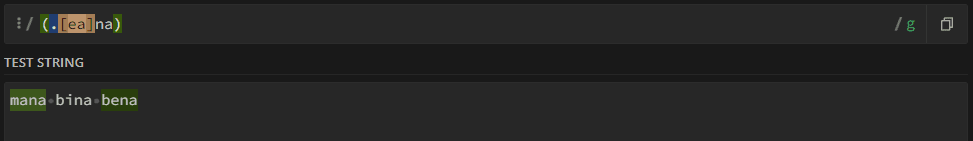 Diyelim ki, "mana bina bena" string değerinin 1. karakteri herhangi bir karakter, 2. karakter sadece "a" ve "e" harflerini kapsasın, diğer 2 karakterde "na" karakteri olsun. Bu durumu ifade etmek için /[ea]na/ kullanabiliriz.