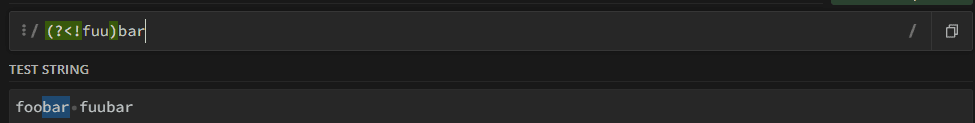 (?<!...): Negative lookbehind, lookbehind'ın tam tersidir. Diyelim ki, "foobar fuubar" string verimizdeki önünde "fuu" olmayan "bar" kelimesini almak istiyoruz. Bu durumu ifade etmek için /(?<!fuu)bar/ kullanabiliriz.