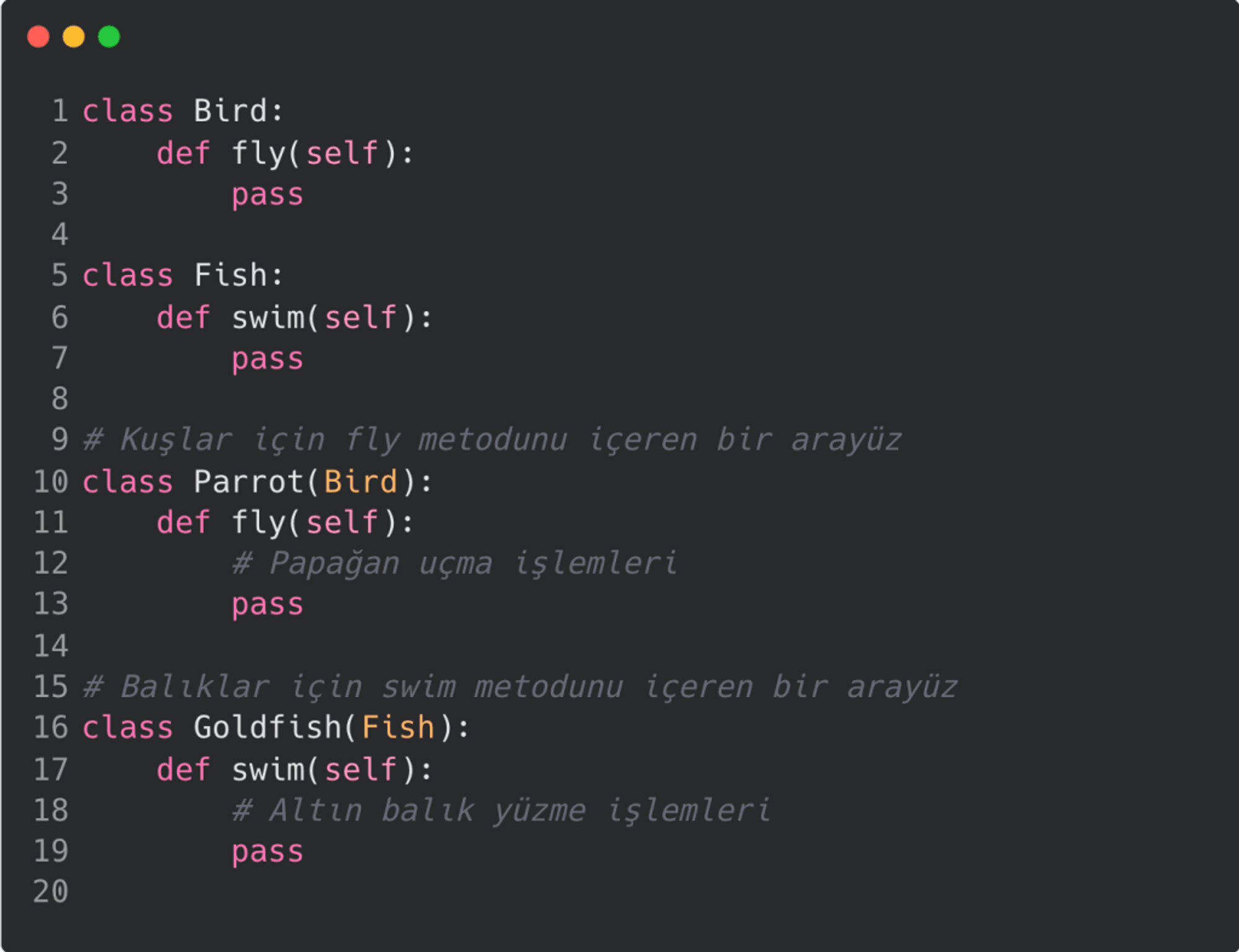 Örneğin, bir geometrik şekiller uygulaması geliştiriyorsanız, tüm şekillerin bir Shape sınıfından türetilmiş olması ve her bir şeklin draw metodunu implemente etmesi gerekir.