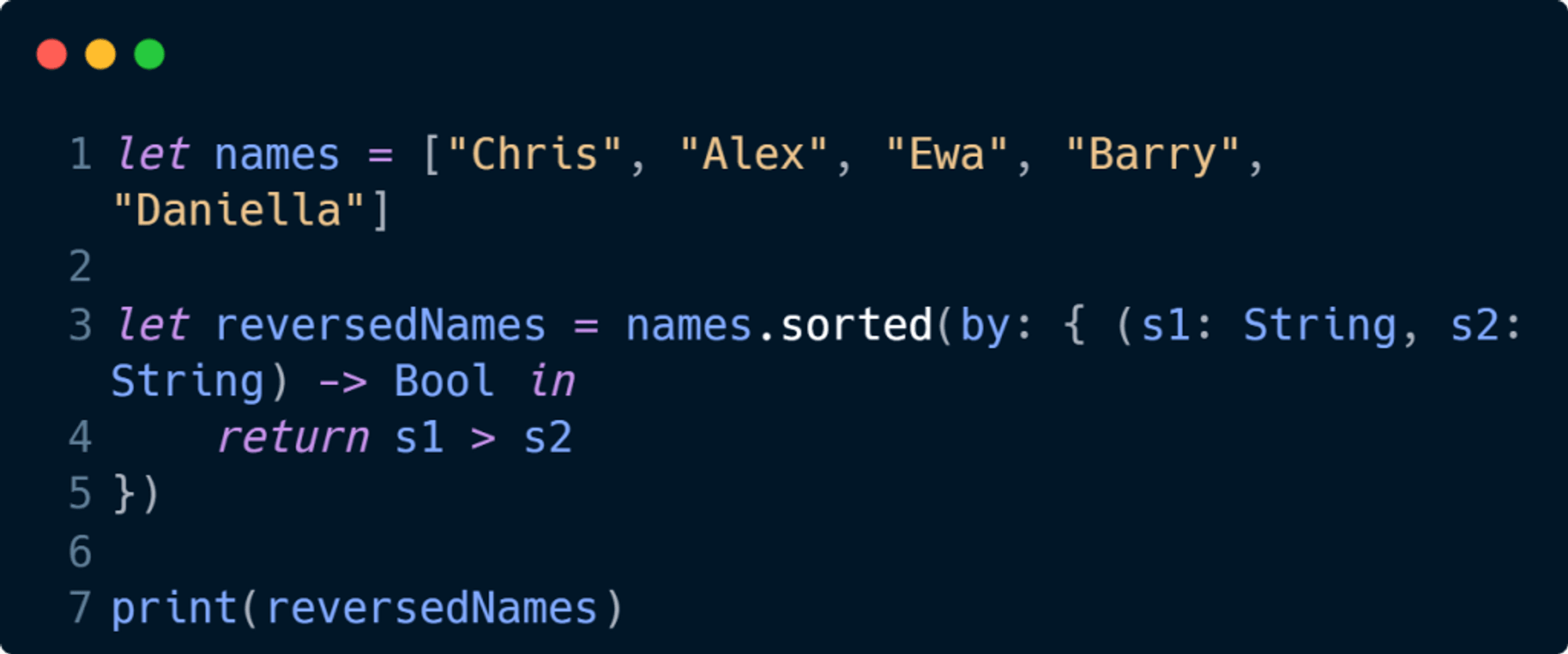 Bu örnek, Swift'te closures'lerin nasıl kullanıldığını gösterir. sorted fonksiyonu, bir kapanış kullanarak isimleri ters sırada sıralar.