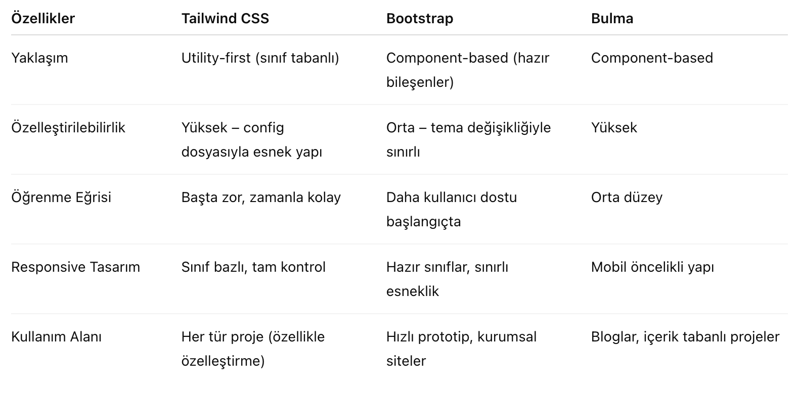 - Bulma, minimal bir yapı sunar ancak topluluk desteği ve ekosistem açısından Tailwind’in gerisindedir.