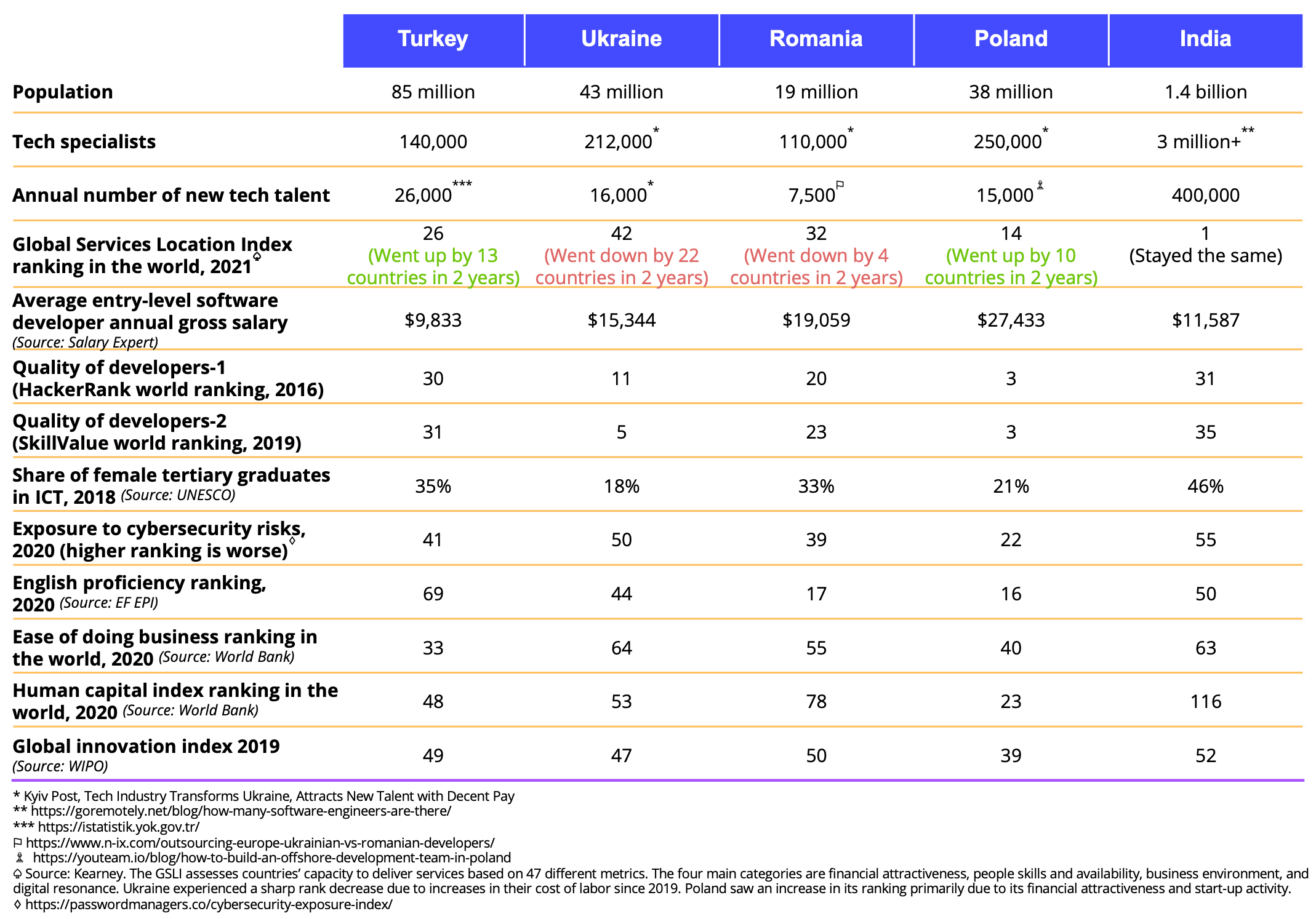 I compared Turkey and four popular IT outsourcing destinations.
