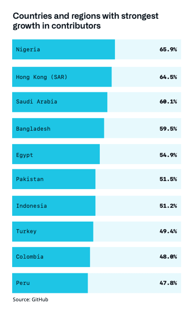 - One of the strongest growth in tech communities takes place in Turkey: According to Github, Turkey is among the top 10 countries that have the strongest growth in open source contributions. In 2018, when Ben Frederickson dug into GitHub data to figure out where the world’s software developers live, Turkey was behind Ukraine. But today, Gayan Kuruppu’s dataset demonstrates the striking increase in Turkey’s GitHub activity: The country now has more than 203,000 users (more than 10 times 2018 number), leaving behind Ukraine (199,000+ users) and Romania (182,000 users). The momentum for training more software developers in Turkey is helping this growth.