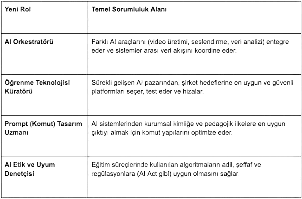 Yapay zeka işleri elimizden almıyor; aksine, operasyonel yükü üstlenerek L&D uzmanlarının rollerini daha stratejik ve yaratıcı bir seviyeye taşıyor. 2026'da modern bir L&D departmanında şu yeni unvanları ve sorumlulukları görmeye başlayacağız: